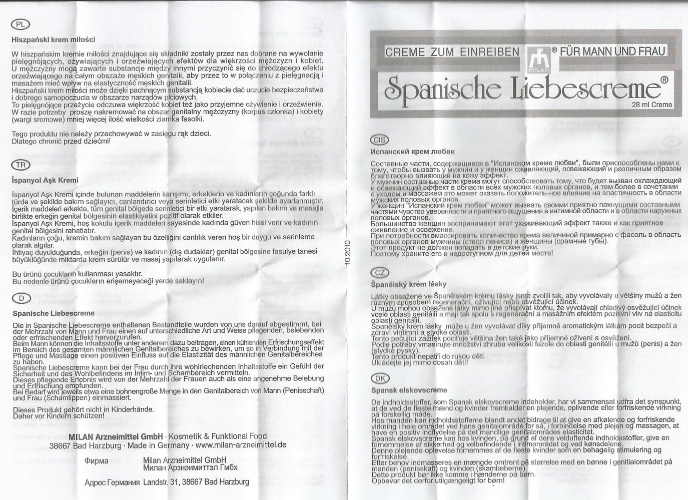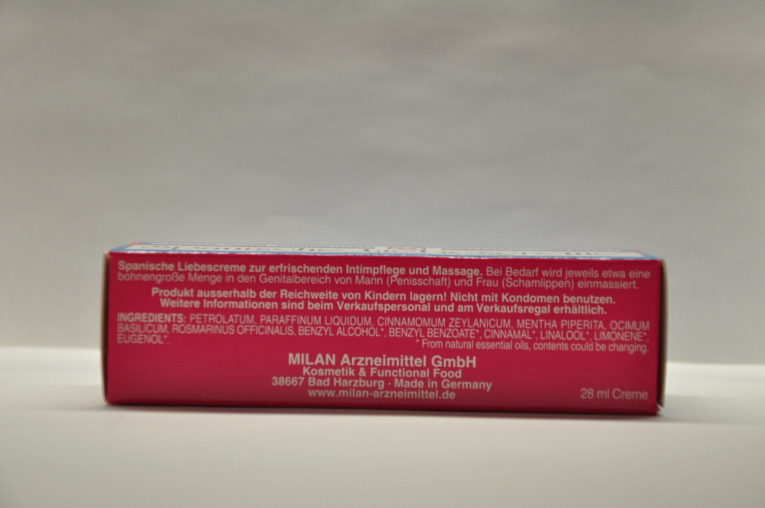 Крем Spanische Liebescreme разработан немецкими фармакологами с целью эффективного и безопасного сексуального возбуждения. Имеет дополнительные ценные качества – обеспечивает бережный уход за кожей в интимных местах, устраняет воспаление и раздражение. Является хорошим профилактическим средством от проблем с кожей в интимных зонах.
