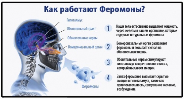Действие феромонов обусловлено сигналом, который поступает от обонятельных рецепторов прямо в мозг, а точнее – в гипоталамус. Этот отдел отвечает за инстинкт размножения, а также агрессию и страх. За улавливание и распознавание рецепторов отвечает особый орган – якобсов орган. На данный момент эволюции у человека он развит слабее, чем у животных. Именно поэтому люди не способны находить и различать запахи, как, например, собака.