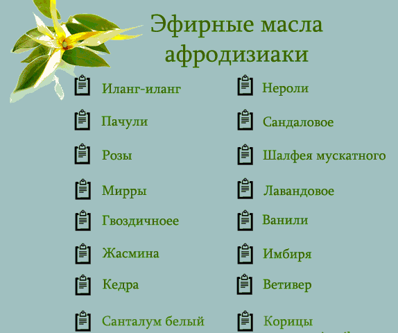 - усиливают либидо: ветивер, пачули, имбирь, иланг-иланг, бергамот;