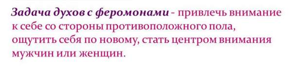 Это, конечно, неполный список, тем более что исследователи индустрии красоты не стоят на месте, и на рынке постоянно появляются новинки, призванные привлекать и соблазнять окружающих. Также феромоны могут быть добавлены в свечи, их можно нанести на лепестки цветов, добавить в бальзам для губ, пенную ванну, смешать с эфирным маслом.