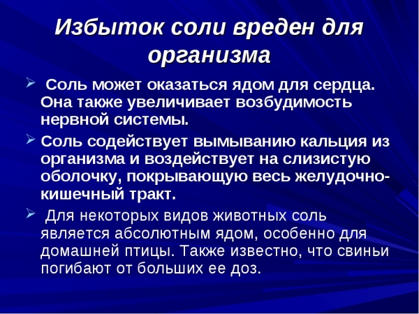 - Соль. Ее применение в пищу стоит сократить в несколько раз, ведь именно она способствует тому, что лишняя вода задерживается в организме, а также повышается давление. Именно это и повлияет негативно на процесс лечения.