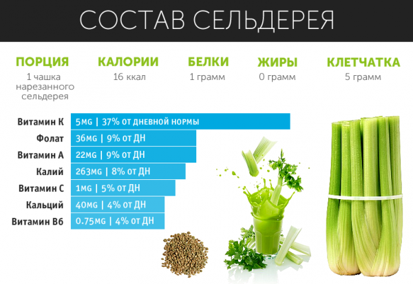 Польза сельдерея содержится абсолютно во всех частях. Можно есть и корни, и стебли, и листья. Продукт содержит огромное количество цинка, магния, кальция, а также клетчатку, железо, натрий, фосфор. Корень растения имеет в себе две важных кислоты — фолиевую, никотиновую, а также аскорбиновую или витамин С, ретинол, рибофлавин, тиамин и токоферол. Все эти вещества оказывают положительное воздействие практически на все системы организма.