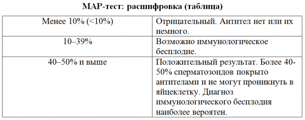 Если мМАР тест положительный, лечение проводится в обязательном порядке, так как это свидетельствует о низком проценте возможности успешного оплодотворения. При положительном результате можно говорить о том, что отклонение от нормы наблюдается в более чем 50 процентах случаев. В данной ситуации может диагностироваться иммунологическое бесплодие у представителей сильного пола. Процент результатов обследования является обратно пропорциональным шансам успешной терапии и оплодотворения.