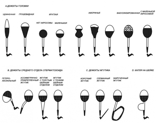 Сперма даже здорового мужчины детородного возраста характеризуется наличием атипичных гаметов. Аномалии можно заметить в таких местах сперматозоида, как: