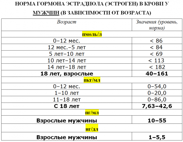 Основанием для установки таких цифр послужили многолетние исследования. На их основе была разработана таблица нормы эстрадиола у мужчин по возрасту. Правда, некоторые лаборатории устанавливают отметки от 11 до 42 пг на мг. Есть и источники, рекомендующие брать за основу показатели от 40 до 161 пмоль на л.