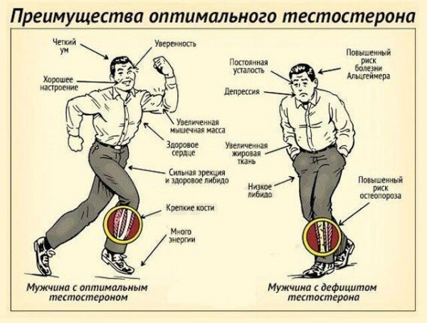За формирование тестостерона в организме представителей сильного пола отвечают яички и надпочечники. Компонент участвует в процессах выработки спермы, увеличении мышц, что придает характерную для мужчин физическую форму. Регулирует настроение, функционирование головного мозга, мышление, способствует развитию памяти, заведует способностью быстро воспринимать информацию.