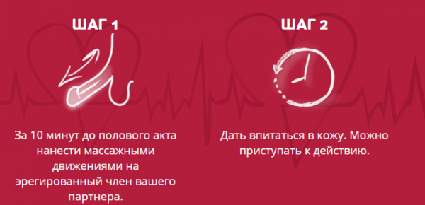 Действие возбудителя начинается через несколько минут после нанесения. Средство вызывает у мужчины прилив крови к половому члену, а женщине обеспечивает дополнительную увлажнённость влагалища и придаёт желаемый эффект. Природные свойства стимулятора помогают партнёрам полностью расслабиться и не думать о болевых ощущениях и дискомфорте.