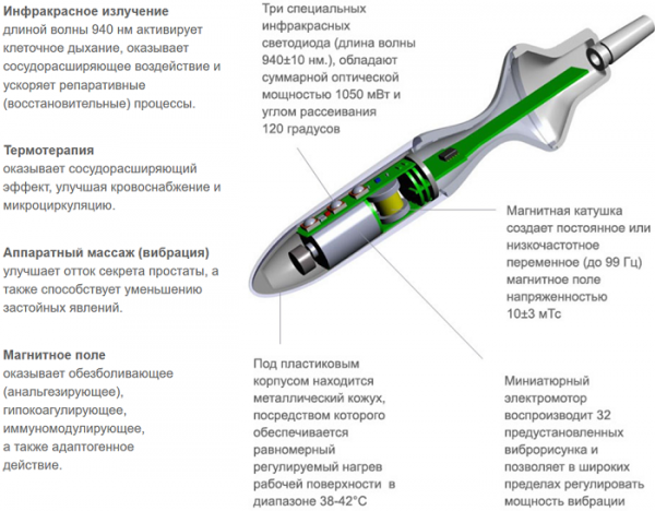 - Инфракрасная терапия. Применяется давно для лечения простаты, но раньше требовалось использование громоздких аппаратов только в условиях поликлиники. С появлением диодов стало возможным установить их в компактный прибор. Микролинзы, встроенные в диоды, помогают получить рассеянный поток инфракрасных лучей, который функционирует в импульсном режиме. Результатом является расширение капилляров и ускорение регенерации тканей.