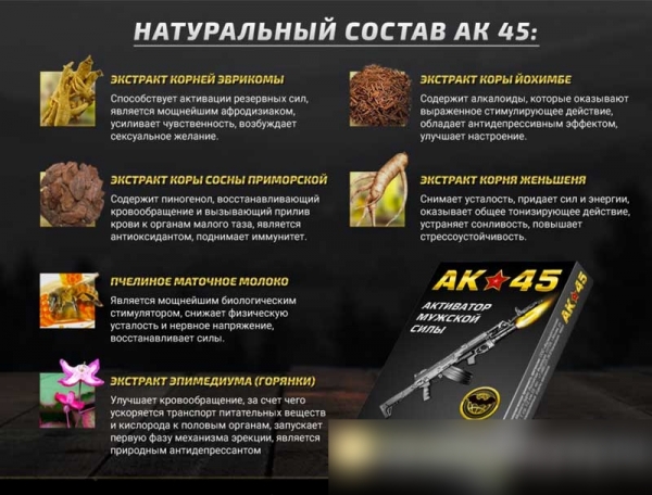 Попробуйте АК 45, который поможет активировать выносливость и улучшит вашу работоспособность. Повышение либидо отлично повлияет на сексуальную жизнь и порадует вас и вашу партнершу.