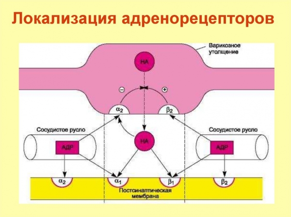 Адреноблокаторы связываются с рецепторами вместо их лигандов (адреналина и норадреналина), в результате такого конкурентного взаимодействия они вызывают совершенно противоположный эффект: