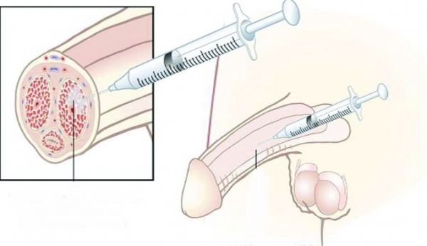 При введении инъекции в пещеристое тело вероятно появление боли в половом члене, приапизм (долговременная эрекция, независящая от возбуждения и полового влечения, иногда сопровождается болезненными ощущениями). На половом члене может появиться сыпь и покраснение, раздражение, фимоз, боль и напряжение распространяется в мошонку, яички, может подняться выше и достичь таза и поясницы, все это сопровождается миастенией, гипестезией.