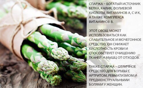 - Стебли спаржи — источник витаминов и микроэлементов. Улучшает обменные процессы, выводит токсины из организма.