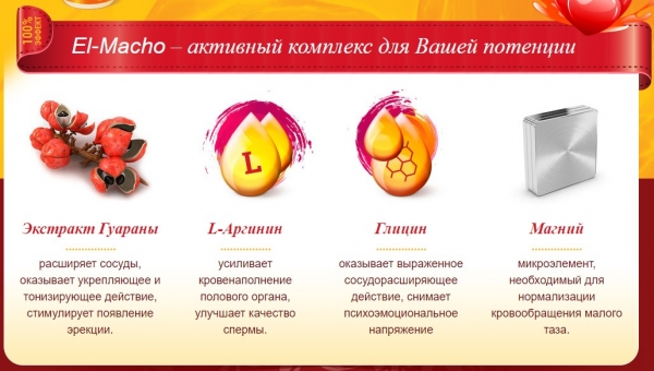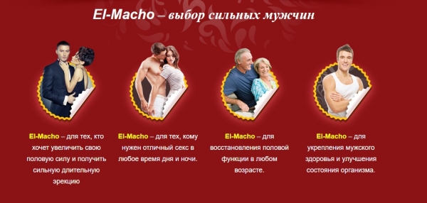 Средство Эль Мачо – разработано для обеспечения стабильной динамики в плане сексуального влечения, а также для поддержания продолжительности полового акта. Препарат выпускается в виде капель, состоит из натурального сырья и продается на официальном сайте по вполне приемлемой цене.