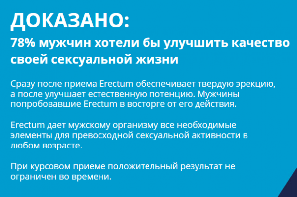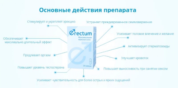 Erectum применяется при плохой половой активности, а также при нестабильной эрекции и недостаточном желании. Очень хорошо помогает мужчинам с преждевременной эякуляцией. Состав препарата исключительно натуральный.