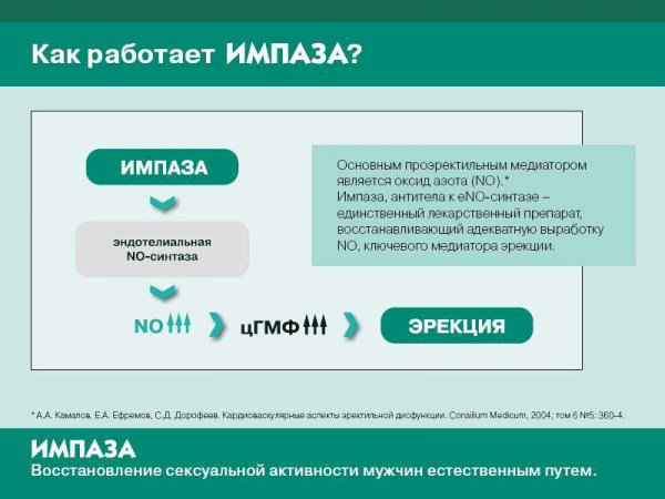 В аннотации прописано, что гомеопатические таблетки Импаза принадлежат к ряду лекарственных препаратов, применяемых для устранения деликатной проблемы у мужчины (отсутствие потенции по различным причинам: органической, психологической или смешанной; быстрое семяизвержение).