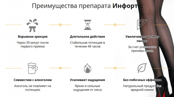 Инфорте – средство для мужчин, одинаково действенное при разовом и курсовом использовании, создано для улучшения эрекции и усиления либидо. Состав БАДа полностью натуральный, в нем нет синтетических веществ или пищевых красителей.