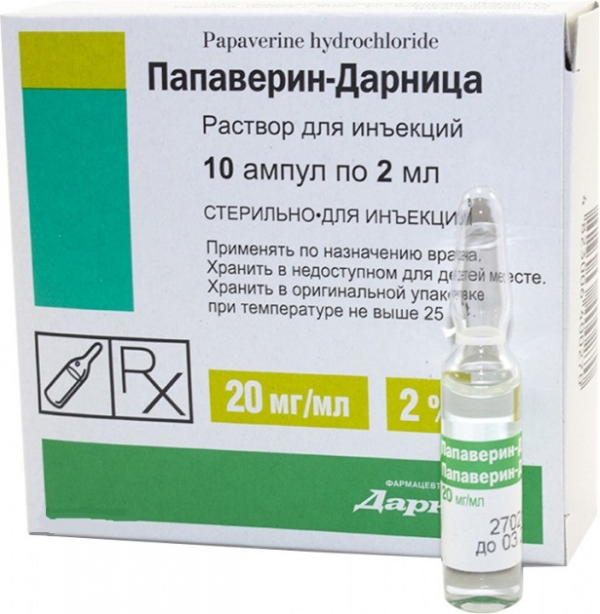 - Инъекции Папаверина. Разовая и суточная доза рассчитываются доктором. В ампулах содержится по 2 мл. Для взрослых суточная доза – 0,3 грамма.