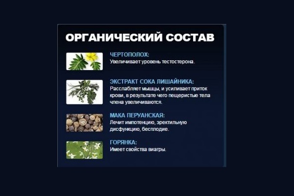 - Экстракт лишайника. Способствует усилению кровотока и возникновению стабильной эрекции.