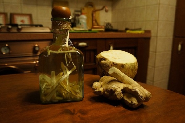 - Настойка хрена. 500 г листьев хрена перемолоть и залить водой. Настаивать на протяжении недели, после чего добавить 2 ст. л. меда и 50 г лимонного сока. Употреблять перед едой по 1 ст. л.