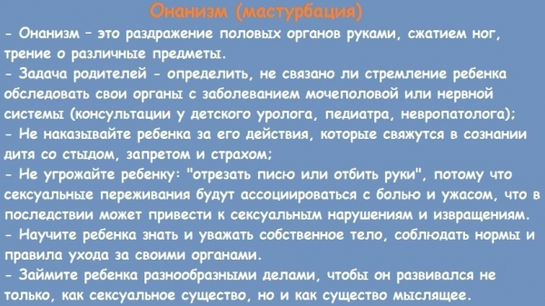 В любом случае папа должен поговорить с подростком по поводу его поведения в сексуальной жизни, объяснить, как правильно вести половую жизнь, насколько вредна мастурбация. Только правильная и полная информация, без нападений и ругательств, поможет ребенку сориентироваться и не приобрести вредную привычку в будущем.