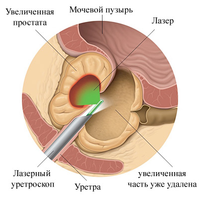 Лазерная энуклеация используется для удаления новообразований больших размеров. В процессе операции проводится выпаривание опухоли под воздействием лазерного луча. Он проникает к аденоме через мочеиспускательный канал. После измельчения опухоли проводится удаление ее остатков и коагуляция поврежденных сосудов.
