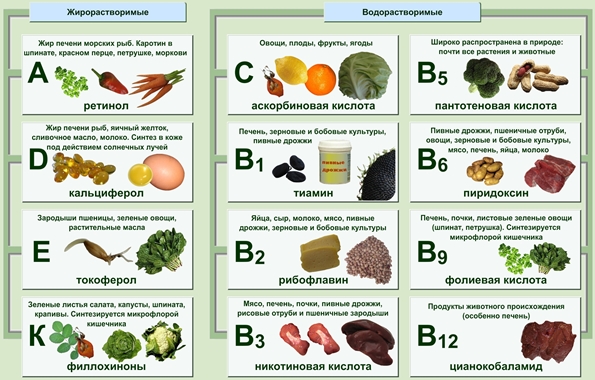 - А, В1. Стимулируют клеточный рост, участвуют в синтезе белка. Из продуктов присутствуют в злаковых, печени, бобовых, моркови, рыбьем жире, молокопродуктах.