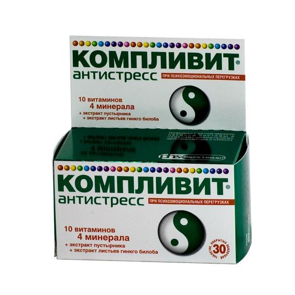 - Компливит антистресс. Самая дешевая альтернатива остальным витаминным препаратам, но не уступающая им в эффективности. Состав витаминов максимально сбалансирован (4 микроэлемента, 10 витаминов) для содействия борьбе организма со стрессами. Витамин А позитивно влияет на работу органов зрения, а в сочетании с токоферолом (Е) может замедлить выпадение волос.