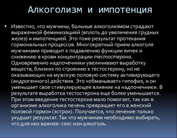 Горячительные напитки кратковременно усиливают эрекцию, но снижают чувствительность нервных окончаний на головке полового члена. В результате половой акт продлевается, но семяизвержение наступает спустя длительное время или не происходит совсем. После окончания полового акта мужчина чувствует опустошение, упадок сил. Радости от интимной близости нет.