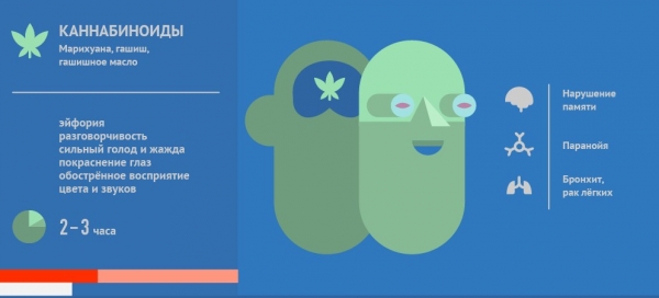 Помимо этого, наблюдается повышение аппетита, сухость во рту и покраснение глазных яблок. Именно по последнему симптому чаще всего находят наркоманов. Эффект достигается за счет быстрого попадания наркотических веществ в кровь. Результат виден сразу, максимальная концентрация – через полчаса, а весь эффект длится часа 4.